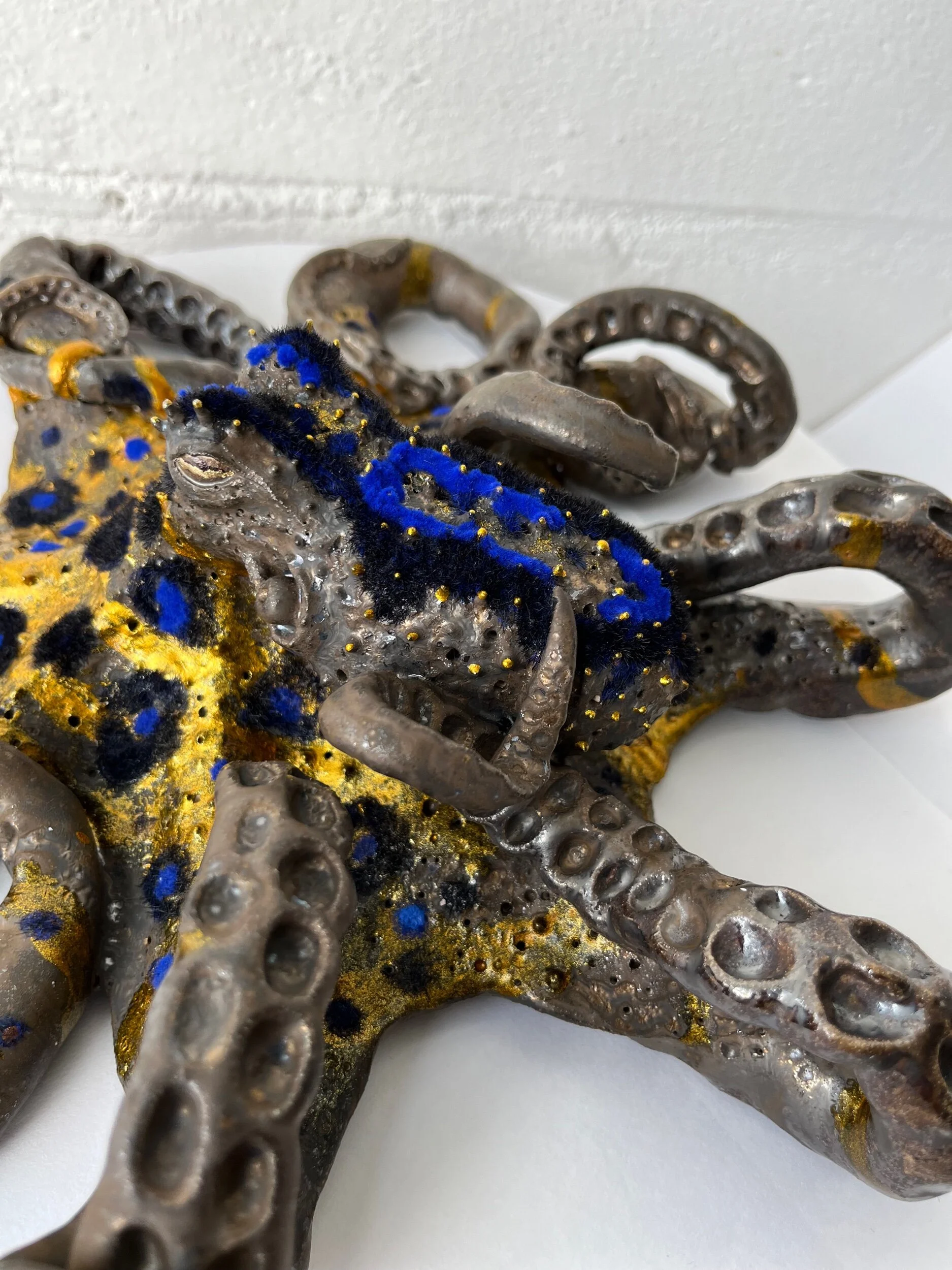 Material - clay glazed with bronze glaze, gold paint and decorated with blue and black velvet.