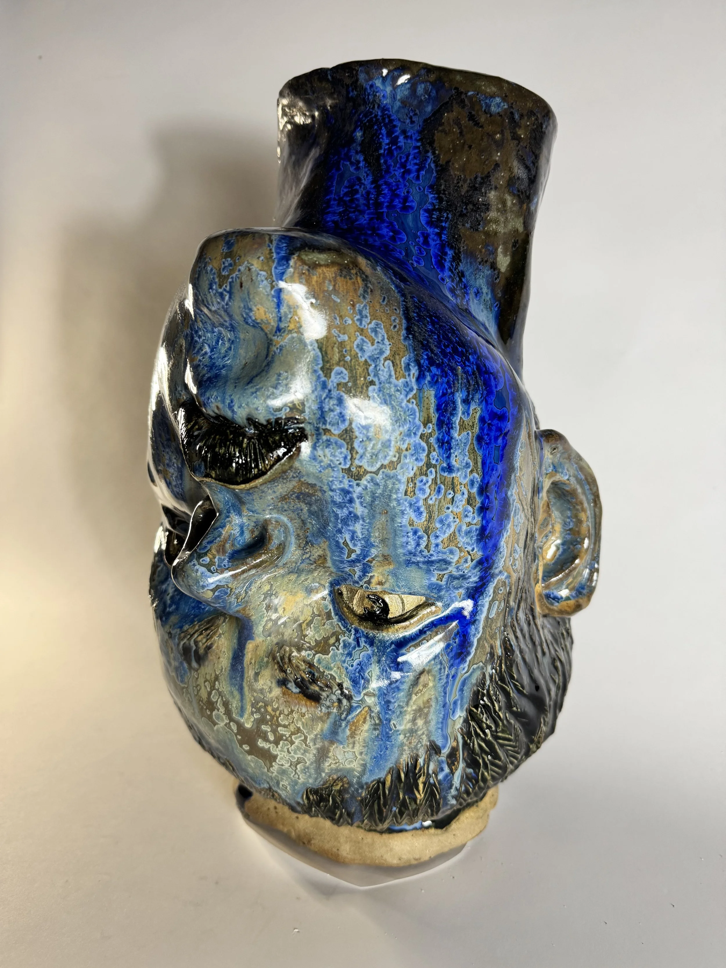 The glaze was another turning point. I fired her upside down so the crystalline glazes could flow across her face. These glazes are unpredictable: during the cooling cycle, crystals grow like ice, spreading in unique patterns across the piece. When I opened the kiln, I was amazed. What had gone in as pale glaze emerged as deep blues, with crystals blooming across her face like galaxies, mosses, or frozen patterns on glass. She looked like Earth herself — alive, layered, echoing both the cosmos and the natural world.